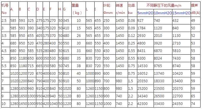 注:1、噪声按GB2888-91标准测试,2、用户对风机性能有特殊要求,我厂可承接新的设计或改型。