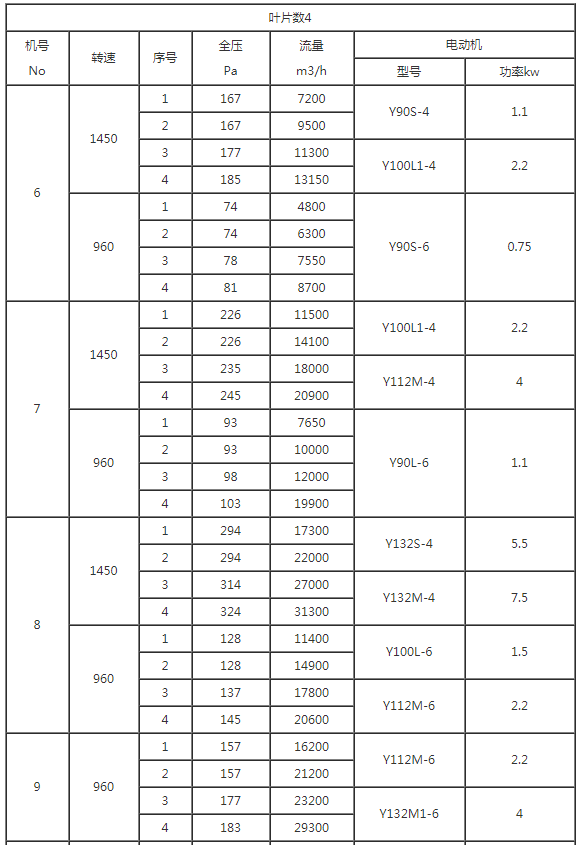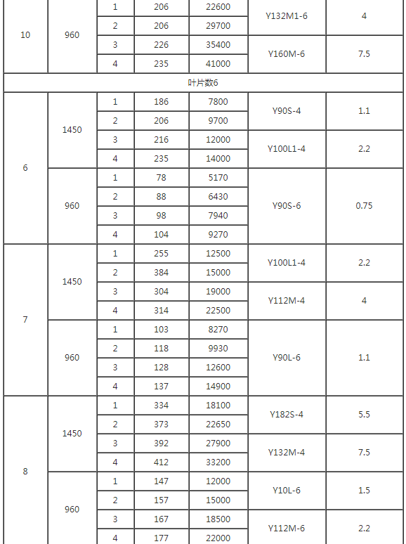 本风机按其叶轮直径共分NO4,5,6,7,8,9,10,11.2.等八个机号,叶片数有4片,6 片两种叶片安装角度可制成 15度, 20度, 25度,30度 四种.