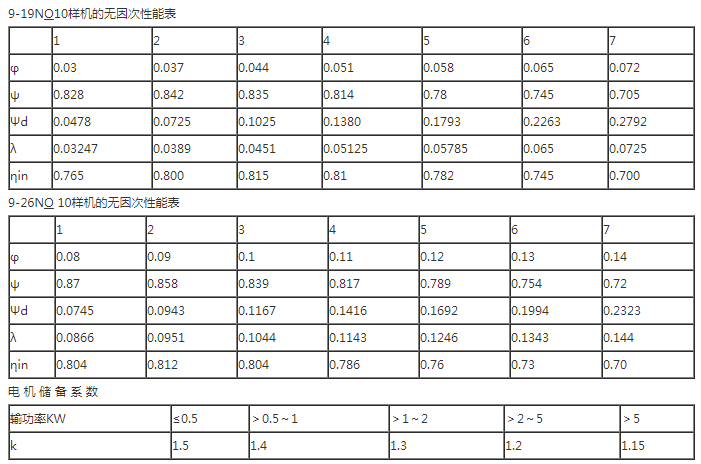 9-19与9-26型风机只给NO10样机的无因次性能表及曲线,由给出的无因次性能表或曲线计算NO10以上风机的有因次性能。