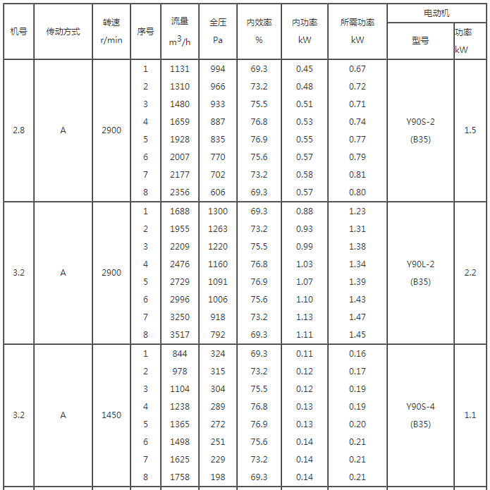 4-72型风机中№2.8~6主要由叶轮、机壳、进风口、电机等部分组成。№8~20除具有上述部分外,还有传动部分。